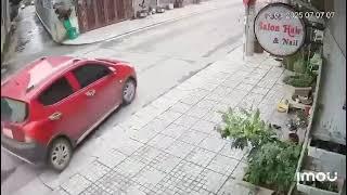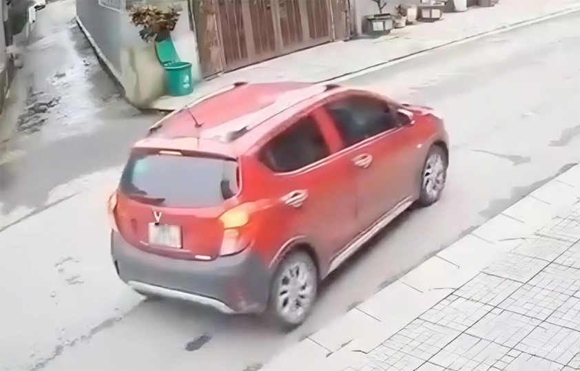Tuy nhiên, ngay sau đó, cháu bất ngờ chạy từ vỉa hè ra lòng đường và bị ngã. Đúng lúc này, một phụ huynh khác lái ô tô màu đỏ chở con đến gửi tại trường.