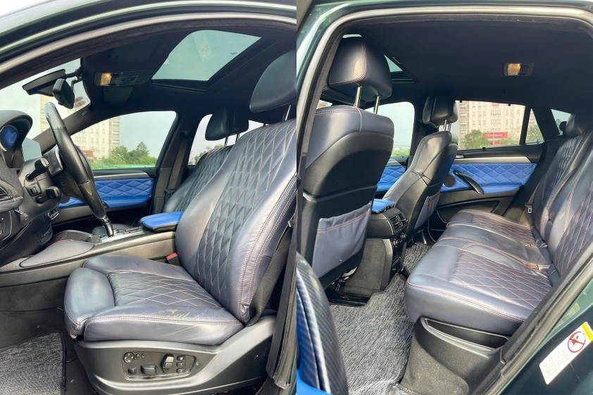 Khoang cabin sử dụng tông màu đen – xanh dương với ghế da chỉnh điện, nhớ vị trí. Dù ghế đã xuất hiện nhiều nếp nhăn do tuổi đời, trang bị tiện nghi vẫn đáng chú ý: điều hòa tự động hai vùng, cửa sổ trời và nhiều chi tiết ốp carbon.