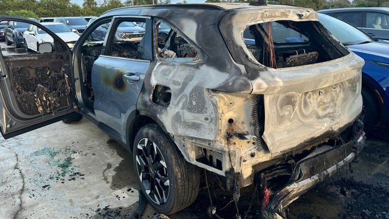 Một chiếc Kia Sorento 2024 bị nước tàn phá nằm trong bãi đậu xe tại Ken Ganley Kia New Port Richey, Florida