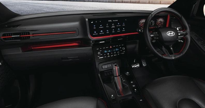 Nội thất của Hyundai Creta N Line 2025 cũng mang đậm phong cách thể thao với các điểm nhấn màu đỏ nổi bật trên viền màn hình cảm ứng trung tâm, cửa gió điều hòa và cần số. Ghế ngồi và cần số cũng được khâu bằng chỉ đỏ, tạo cảm giác năng động và hiện đại.
