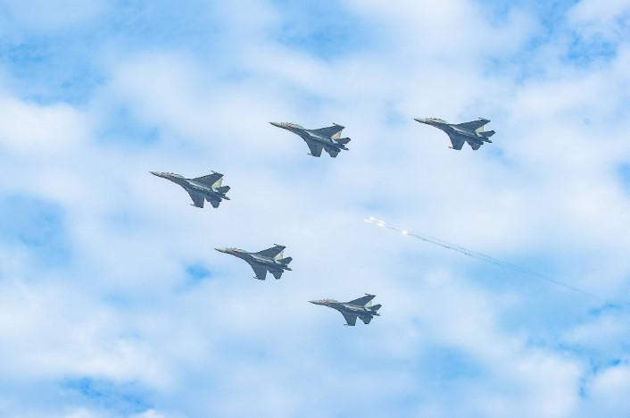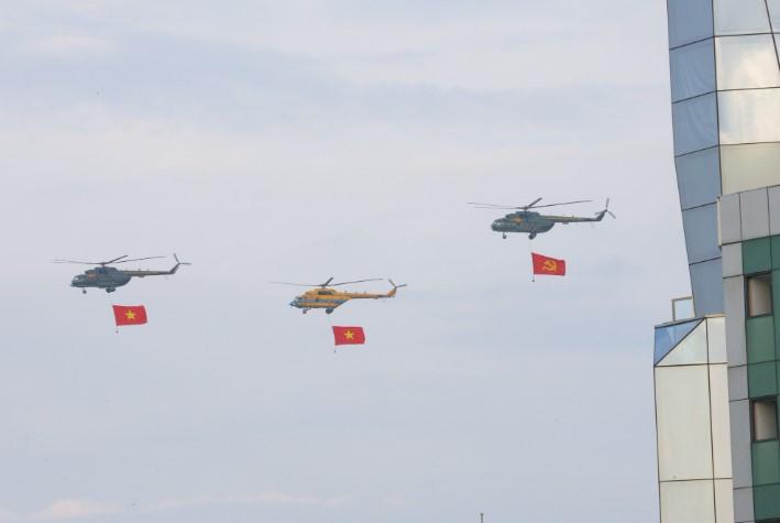 Mở đầu buổi tổng duyệt là màn biểu diễn ngoạn mục của biên đội tiêm kích Su-30MK2 thuộc Không quân nhân dân Việt Nam.