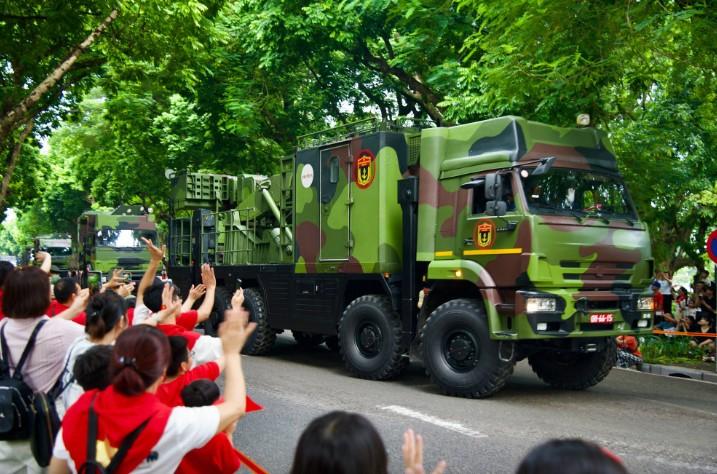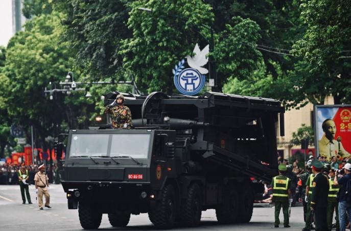 Nổi bật trong đội hình là xe mang tổ hợp tên lửa phòng không do Việt Nam cải tiến, thể hiện năng lực phòng thủ tầm xa.