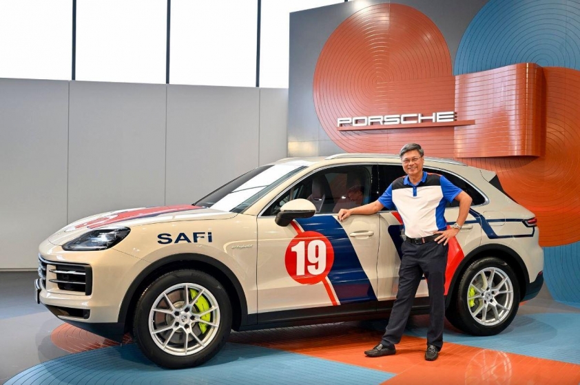 Chiếc Cayenne S E-Hybrid màu Cashmere Beige thu hút sự chú ý nhờ bộ tem trang trí độc đáo với logo số 19 bên cánh cửa – biểu tượng quen thuộc gắn liền với anh Nguyễn Hoàng Anh.