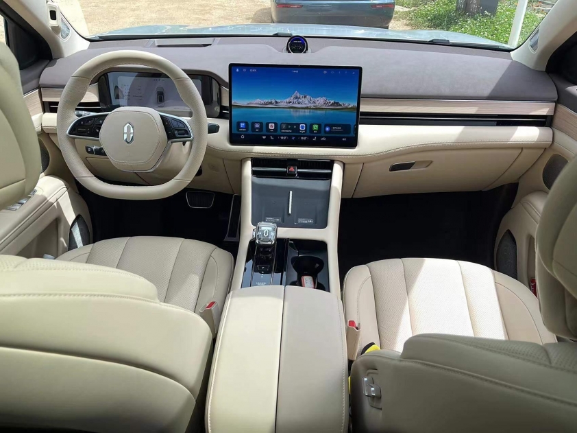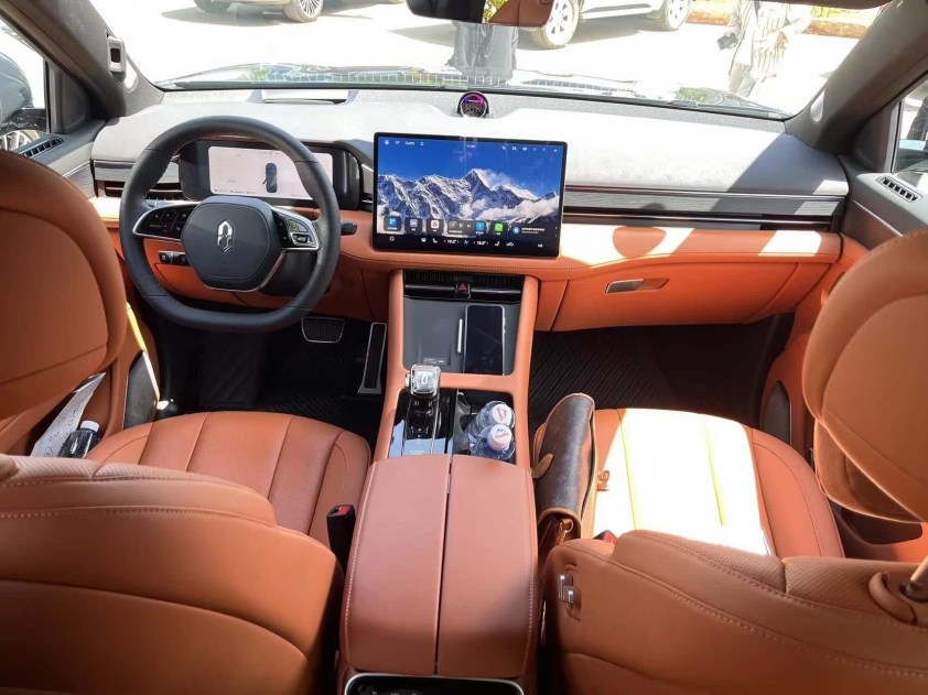 Bên trong, Aito M7 Pro mang đến nhiều tùy chọn nội thất với các tông màu như mơ, nâu hổ phách và cam trà đỏ.Xe được trang bị cụm đồng hồ kỹ thuật số toàn phần cong 10,25 inch và màn hình giải trí 15,6 inch 2K.