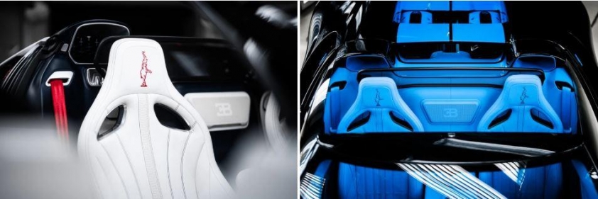 Trong khi đó, chiếc xe còn lại sử dụng da màu xanh Bugatti Light Blue Sport, đi cùng đường chỉ đen Begula Black, tạo nên phong cách "ton sur ton" đầy ấn tượng.