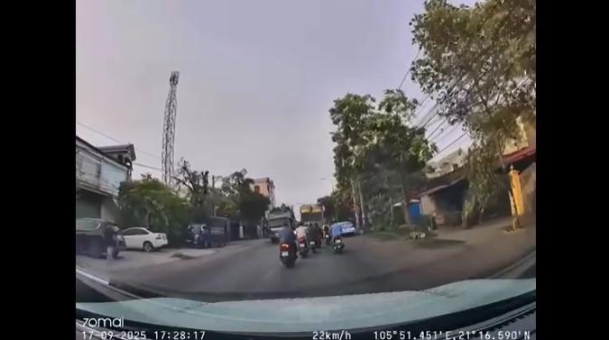 Tình huống va chạm nguy hiểm tại Sóc Sơn, Hà Nội, ghi lại cảnh xe máy mất lái vì phanh gấp và ngã ra làn ngược chiều, may mắn không dẫn đến hậu quả nghiêm trọng.
