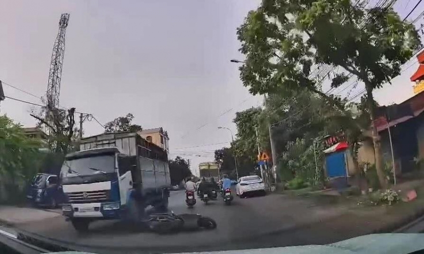 Khi bất ngờ phanh gấp để tránh va chạm, bánh xe máy bị trượt dài khiến nạn nhân ngã sang làn đường ngược chiều, đúng lúc một chiếc xe tải lao tới.