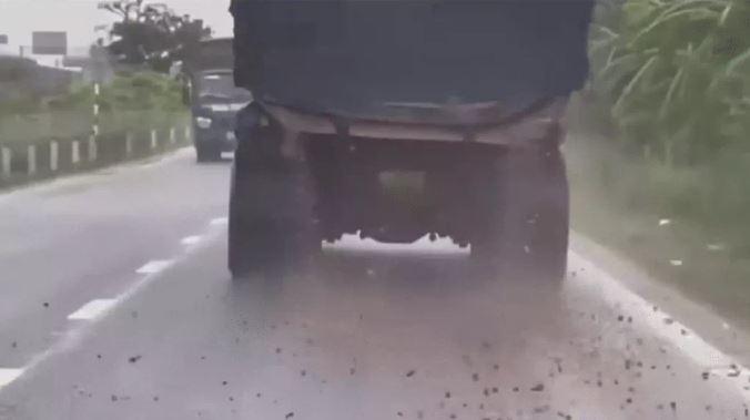 Trong quá trình di chuyển, lượng lớn đất đá từ thùng xe rơi vãi xuống mặt đường, kéo dài khoảng 300m.