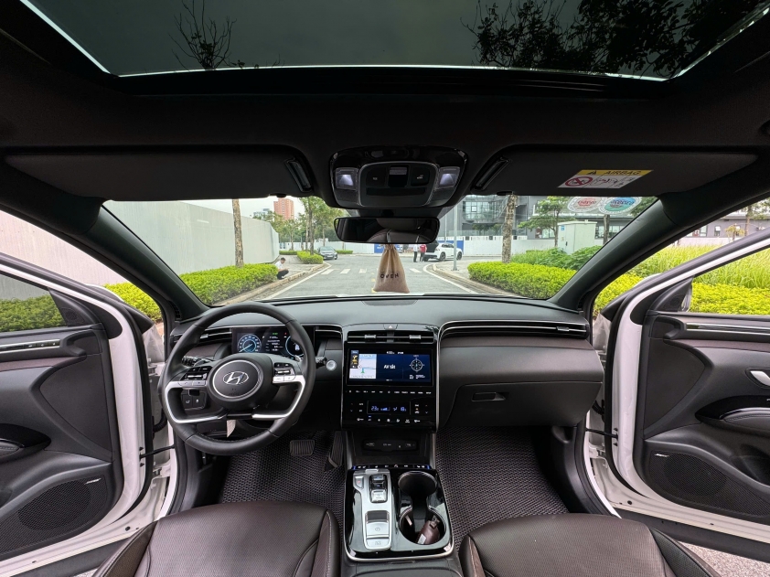 Bên trong khoang lái, Tucson 1.6 Turbo sở hữu không gian nội thất hiện đại với tông màu xám lông chuột kết hợp nâu đậm. Các trang bị nổi bật bao gồm vô-lăng 4 chấu, lẫy chuyển số thể thao, cụm đồng hồ tốc độ full LCD 10,25 inch, màn hình cảm ứng trung tâm 10,25 inch, hệ thống âm thanh 8 loa Bose, và điều hòa tự động 2 vùng độc lập.
