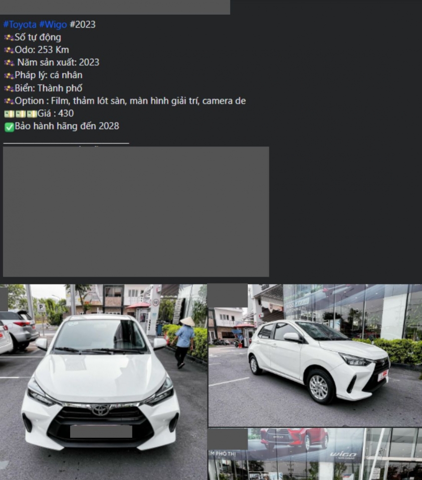 Theo ghi nhận trên thị trường xe đã qua sử dụng, một chiếc Toyota Wigo đời 2023 đang được một salon chào bán với giá 430 triệu đồng.