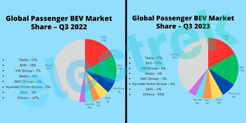 Theo công ty nghiên cứu công nghệ Counterpoint Research, vào cuối quý 3 năm 2023, BYD đã bắt kịp Tesla, nắm giữ 17% tổng doanh số BEV toàn cầu – ghi nhận mức tăng trưởng lên tới 68% so với cùng kỳ năm trước.