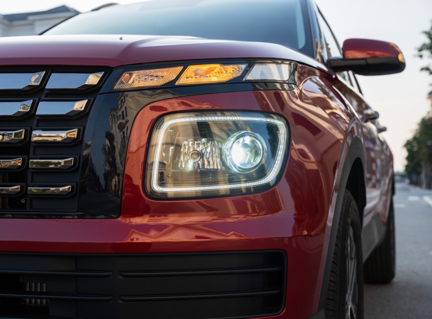Ngoại thất xe mang dáng dấp thừa hưởng từ "đàn anh" Palisade với lưới tản nhiệt kích thước lớn tạo hình thác nước Cascading Grill theo phong cách Parametric Dynamic. Cụm đèn chiếu sáng dạng Projector LED được thiết kế tách cụm mới, đặc trưng bởi đường nét sắc sảo và tinh tế. Đèn định vị ban ngày DRL (Daytime Running Light) của xe được thiết kế bao quanh cụm đèn pha tạo nên nét độc đáo cho xe. Cản trước được sơn màu bạc, tạo nên vẻ hiện đại năng động.