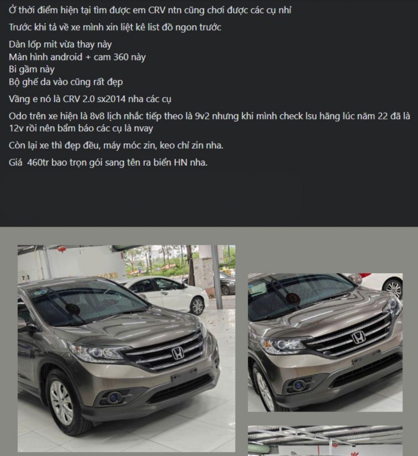 Qua khảo sát trên thị trường xe cũ, một chiếc Honda CR-V đời 2014, sử dụng động cơ xăng 2.0L, đang được rao bán với giá 460 triệu đồng.