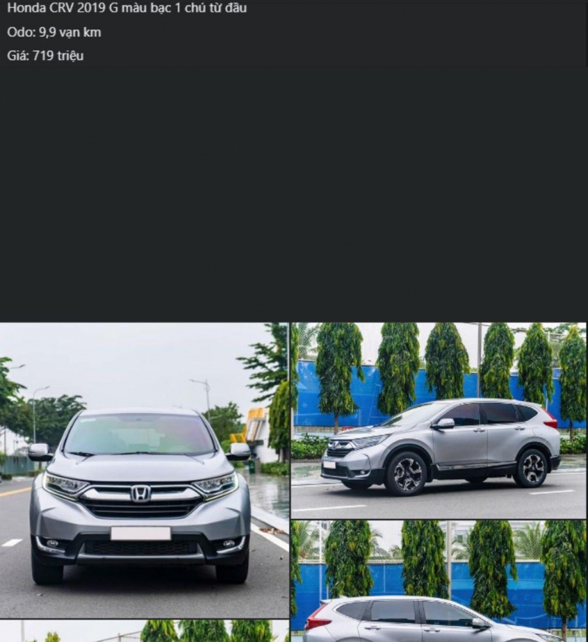 Hiện tại, một chiếc Honda CR-V 2019 đang được rao bán trên thị trường xe cũ với mức giá 719 triệu đồng. Xe thuộc phiên bản G, ngoại thất màu bạc và nội thất màu đen, đã đi được 99.000 km.