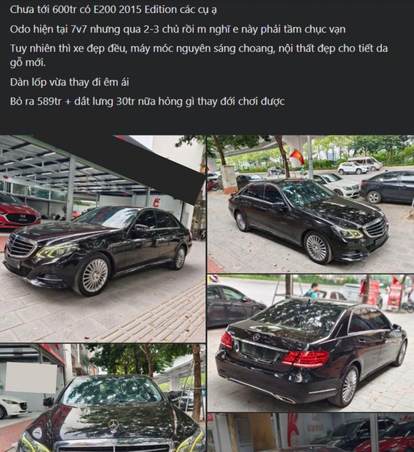 Mercedes-Benz E200 ra mắt thị trường Việt Nam từ tháng 7/2013 với giá bán khởi điểm là 1,939 tỷ đồng. Tuy nhiên, chiếc Mercedes-Benz E200 đời 2015 được đề cập trong bài viết này đã lăn bánh hơn 77.000 km và hiện đang được rao bán với giá hơn 589 triệu đồng, mức giá gần tương đương với chiếc Hyundai Accent phiên bản cao cấp nhất (569 triệu đồng).