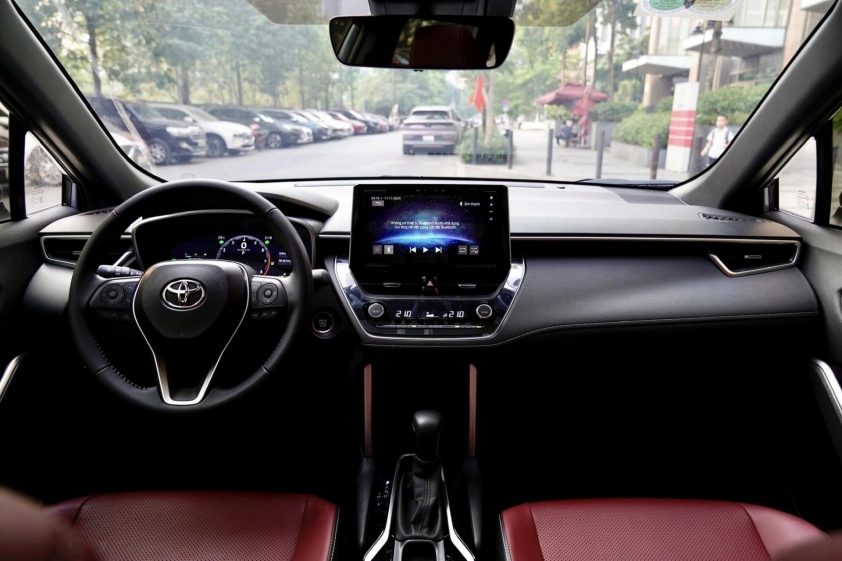 Không gian nội thất của Corolla Cross 2024 được nâng cấp đáng kể với hai lựa chọn màu sắc là đen hoặc đỏ. Ghế da được may tỉ mỉ với những đường chỉ tinh tế, tạo cảm giác sang trọng. Xe được trang bị màn hình hiển thị đa thông tin cỡ lớn 12.3 inch cho cả hai phiên bản và màn hình giải trí 9 inch có khả năng kết nối không dây với điện thoại thông minh.