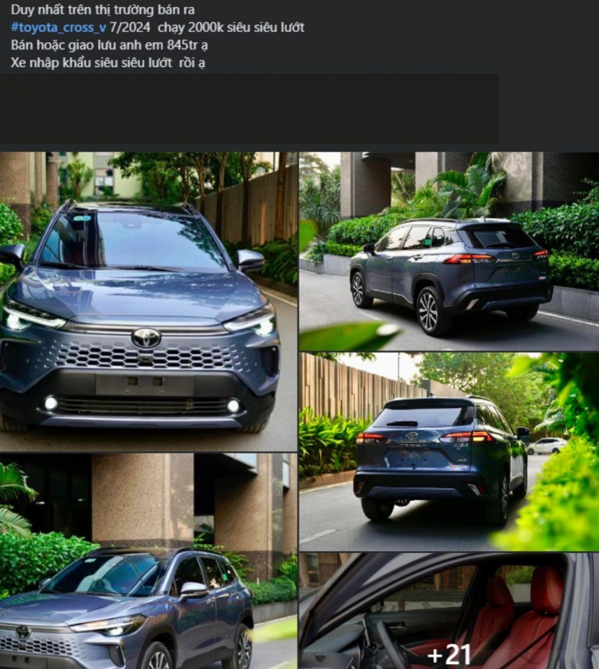 Đáng chú ý nhất là một chiếc Corolla Cross phiên bản 1.8V sản xuất năm 2024, thuộc phiên bản nâng cấp giữa vòng đời mới ra mắt hồi tháng 5. Xe có ngoại thất màu xanh, đã lăn bánh 2.000 km và đang được chào bán với giá khoảng 845 triệu đồng.