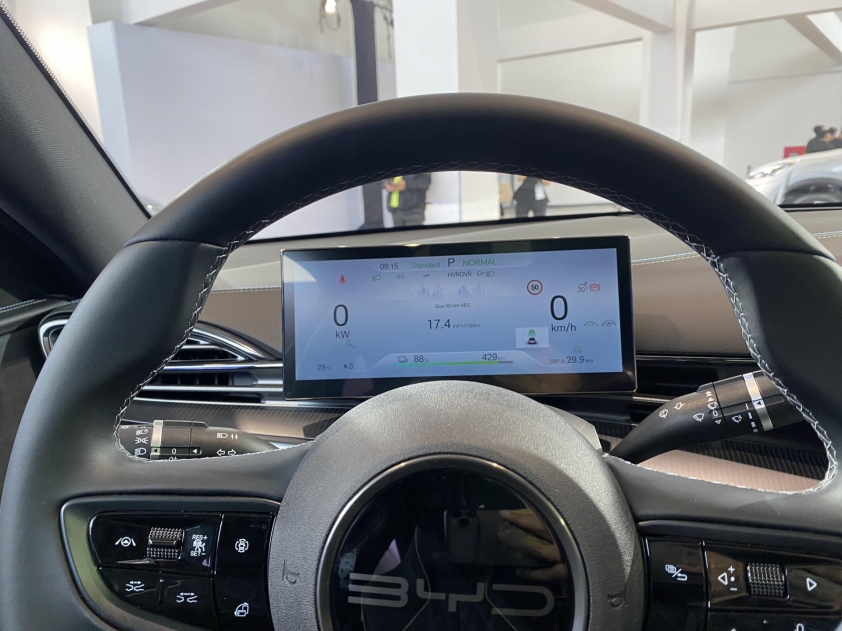 Nội thất của Seal không quá cầu kỳ, nhưng vẫn có một số điểm tương đồng với Atto3 như vô-lăng và màn hình xoay 15,6 inch. Ghế ngồi của Seal là loại thể thao, có thể chỉnh điện 8 hướng, tích hợp sưởi và thông gió.