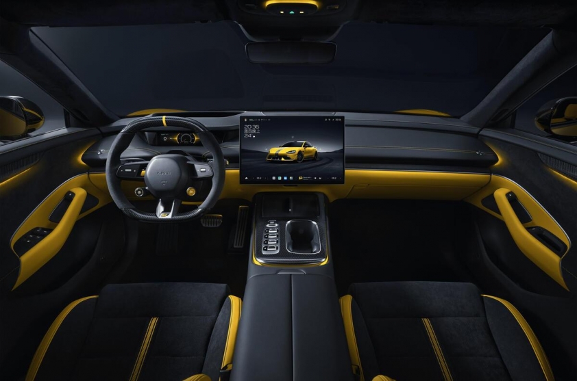 Bên trong, Xiaomi SU7 Ultra có ghế thể thao, dây an toàn màu vàng và vô lăng bọc da Alcantara. Nội thất của xe cũng sử dụng da Alcantara cho ghế, bề mặt cửa và các chi tiết khác. Ngoài ra, phương tiện cũng có các bộ phận nội thất bằng sợi carbon như bậc cửa, bảng điều khiển trung tâm và gương chiếu hậu trong cabin.