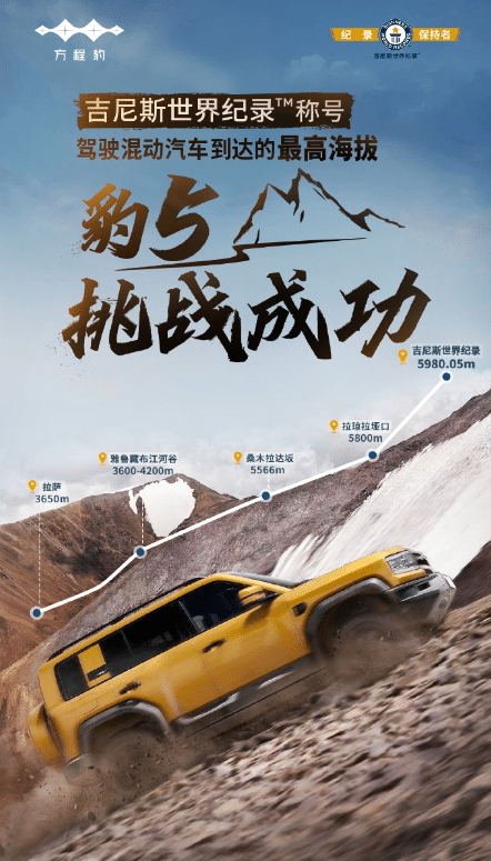 Ngày 12 tháng 7, thương hiệu Fang Cheng Bao của BYD đưa ra thông báo rằng chiếc SUV địa hình Bao 5 đã thiết lập Kỷ lục Guinness Thế giới về độ cao cao nhất đạt được bởi một phương tiện plug-in hybrid (xe hybrid cắm sạc), với độ cao 5.980 mét.