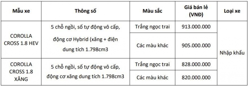 Toyota Việt Nam đã công bố giá dự kiến cho Corolla Cross 2024 vào ngày hôm nay, 5/4, trước thời điểm ra mắt chính thức. Xe được phân phối với hai phiên bản: xăng (V) và hybrid (HEV), với giá niêm yết lần lượt là 820 triệu và 905 triệu đồng. Phiên bản màu trắng được bán với giá cao hơn 8 triệu đồng.