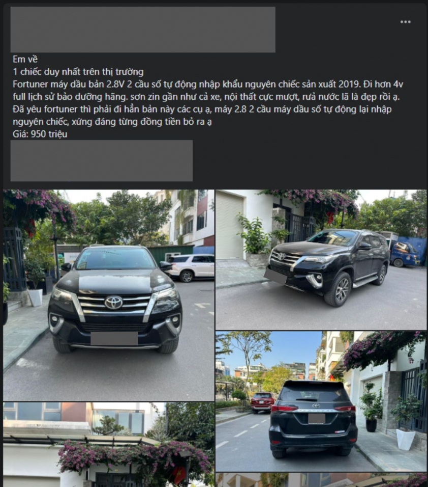 Theo khảo sát trên thị trường xe cũ, mới đây một chiếc Toyota Fortuner 2019 bản máy dầu 2.8V 2 cầu số tự động (bản cao nhất) đang được một showroom rao bán với mức giá 950 triệu đồng.