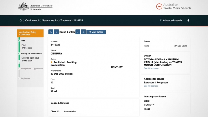 Mặc dù tờ Drive đã liên hệ, Toyota Australia không đưa ra câu trả lời về việc đăng ký thương hiệu Century.