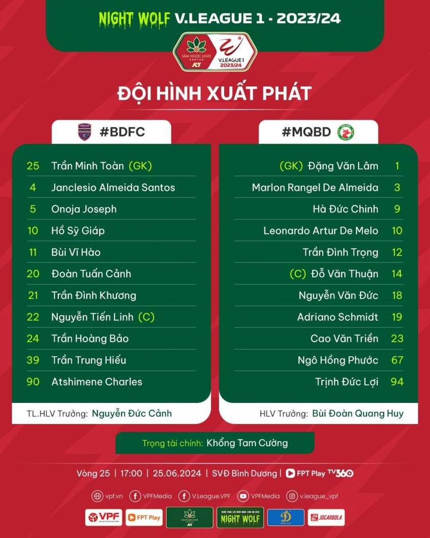 - Bình Dương: Minh Toàn, Quang Hùng, Janclesio, Đình Khương, Trung Hiếu, Minh Khoa, Duy Thường, Onoja, Atshimene, Vĩ Hào, Tiến Linh.