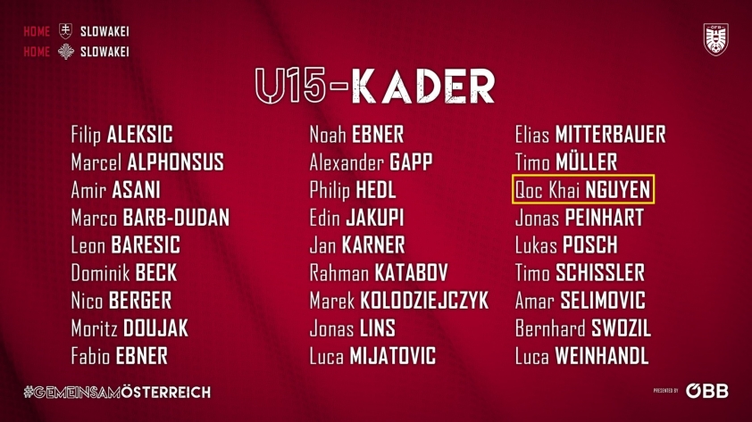 Được biết, U15 Áo triệu tập các cầu thủ để rèn luyện và thi đấu giao hữu với U15 Slovakia vào hai ngày 5 và 7/3 sắp tới.