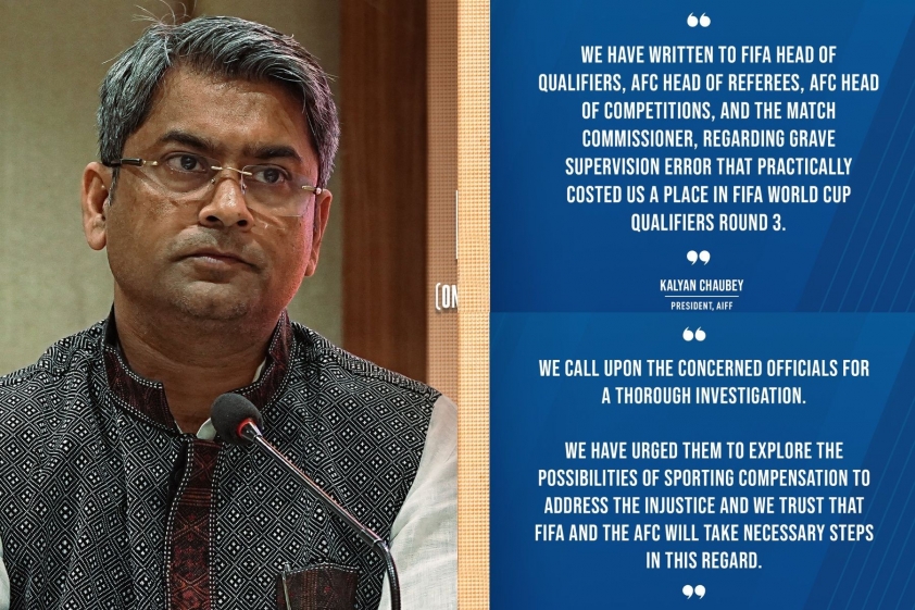 "Chúng tôi đã gửi những lá đơn cho các quan chức của FIFA, người đứng đầu các trọng tài AFC, người đứng đầu các giải đấu AFC và ủy viên trận đấu. Đây là về một lỗi giám sát khiến chúng tôi không đủ điều kiện tham gia vòng thứ ba của World Cup 2026 ở khu vực châu Á", Kalyan Chaubey, chủ tịch LĐBĐ Ấn Độ phát biểu.