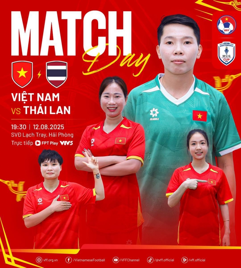 Vào 19h30 ngày 12/8/2025, đội tuyển nữ Việt Nam sẽ đối đầu Thái Lan tại SVĐ Lạch Tray trong khuôn khổ vòng bảng AFF Cup nữ 2025. Đây là trận đấu quan trọng ảnh hưởng đến vị trí đầu bảng. Người hâm mộ có thể xem trực tiếp trên VTV5. Trận cầu hứa hẹn kịch tính khi cả hai đội đều quyết tâm giành kết quả tốt. Cổ động viên Việt Nam đang đặt nhiều kỳ vọng vào đội nhà sau những màn trình diễn ấn tượng gần đây.