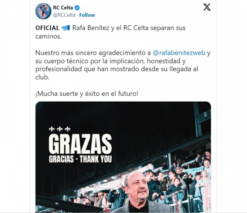 Celta Vigo đã gửi lời cảm ơn Benitez và các nhân viên sắp rời đi của ông trong một tuyên bố mới nhất, nhấn mạnh “sự trung thực và tính chuyên nghiệp” của họ trong suốt thời gian ở câu lạc bộ.