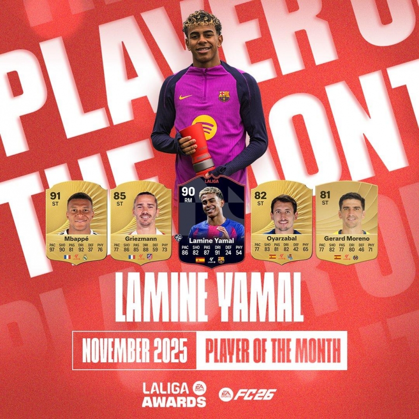 Phong độ của Yamal gần đây cực kỳ ấn tượng. Tài năng 18 tuổi ghi bàn trước Elche, Celta Vigo và Alaves, đồng thời có hai kiến tạo trong chiến thắng trước Athletic Club. Tổng cộng trong tháng 11, anh ghi 3 bàn và 3 kiến tạo, dẫn đầu La Liga về số đường kiến tạo (8). Nhờ đó, Yamal vượt qua các đối thủ lớn như Mbappé hay Griezmann để giành giải Cầu thủ xuất sắc nhất tháng.
