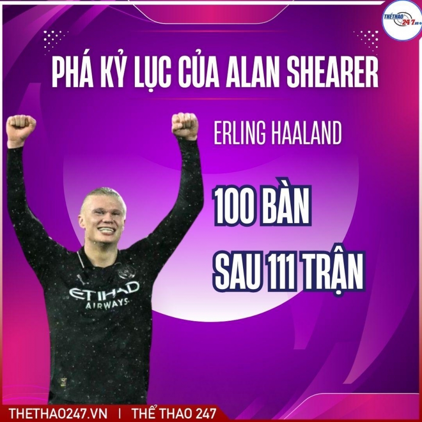 Đáng chú ý, Erling Haaland trở thành cầu thủ chạm mốc 100 bàn thắng nhanh nhất trong lịch sử Premier League. Cụ thể, trò cưng của HLV Pep Guardiola chỉ cần 111 lần ra sân cho Man City để đánh bại tất cả những huyền thoại như Michael Owen, Thierry Henry, Harry Kane, Mohamed Salah hay Alan Shearer - người trước đó xếp hàng thứ nhất với 124 trận để cán mốc 100 bàn tại giải đấu hạng cao nhất của Anh.