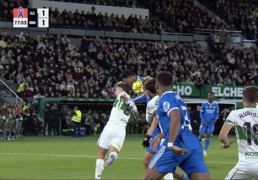 Trước đó, ở bàn gỡ phút 78, bóng đã chạm tay Jude Bellingham khi anh bật cao đánh đầu trước khi Dean Huijsen ghi bàn cho Real Madrid. Ngay lập tức, các cầu thủ Elche vây kín trọng tài chính Jesús Gil Manzano và yêu cầu VAR can thiệp.