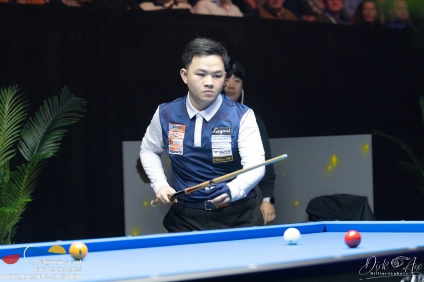 Cơ thủ Bao Phương Vinh thể hiện phong độ ấn tượng khi thắng cả hai trận vòng bảng tại Giải vô địch billiards carom 3 băng thế giới 2025.