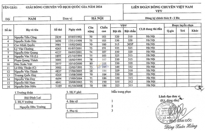 Danh sách cầu thủ Hà Nội giai đoạn 2 giải bóng chuyền nam VĐQG 2024
