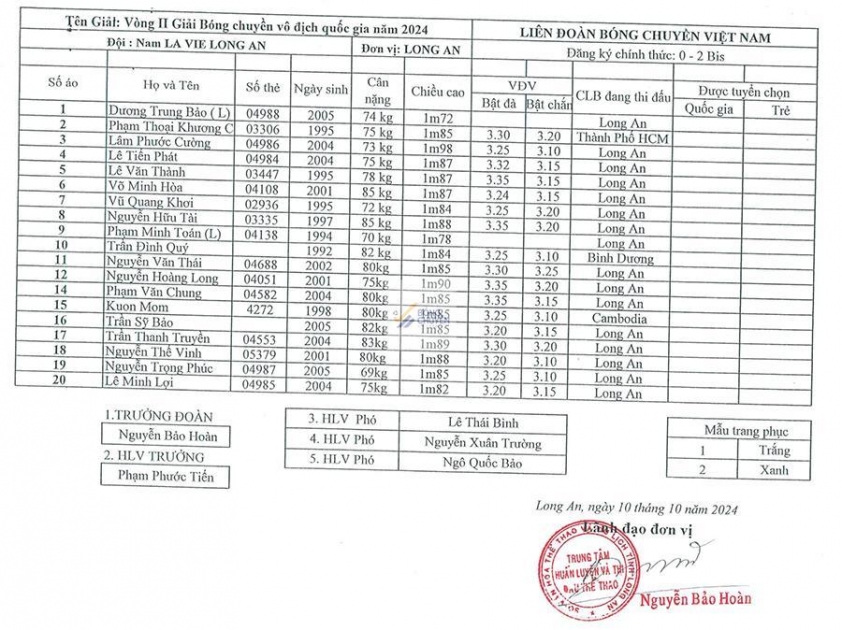 Danh sách cầu thủ Lavie Long An giai đoạn 2 giải bóng chuyền nam VĐQG 2024
