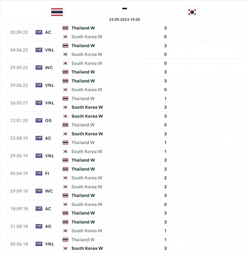 Thống kê lịch sử đối đầu giữa Thái Lan và Hàn Quốc