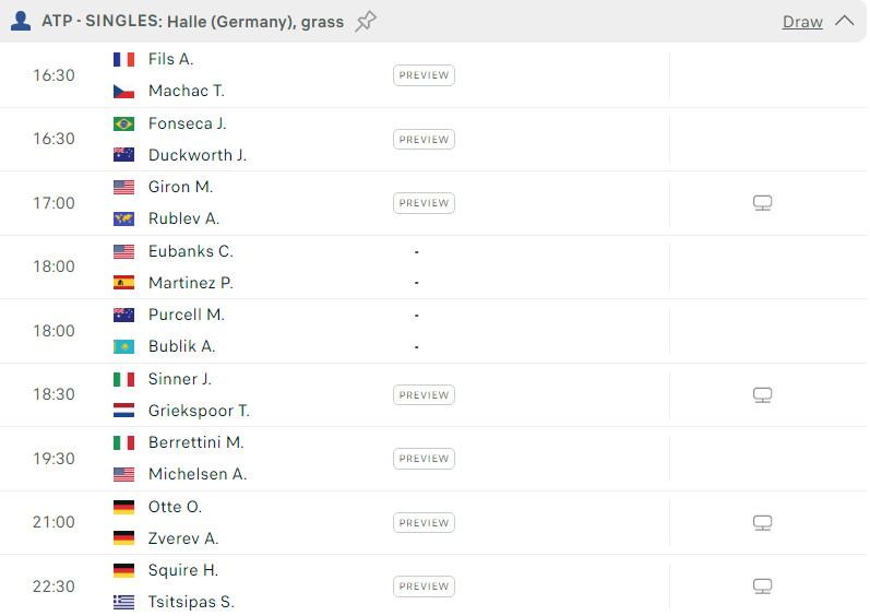 Lịch thi đấu ATP Halle 2024 - Vòng 1/16 đơn nam