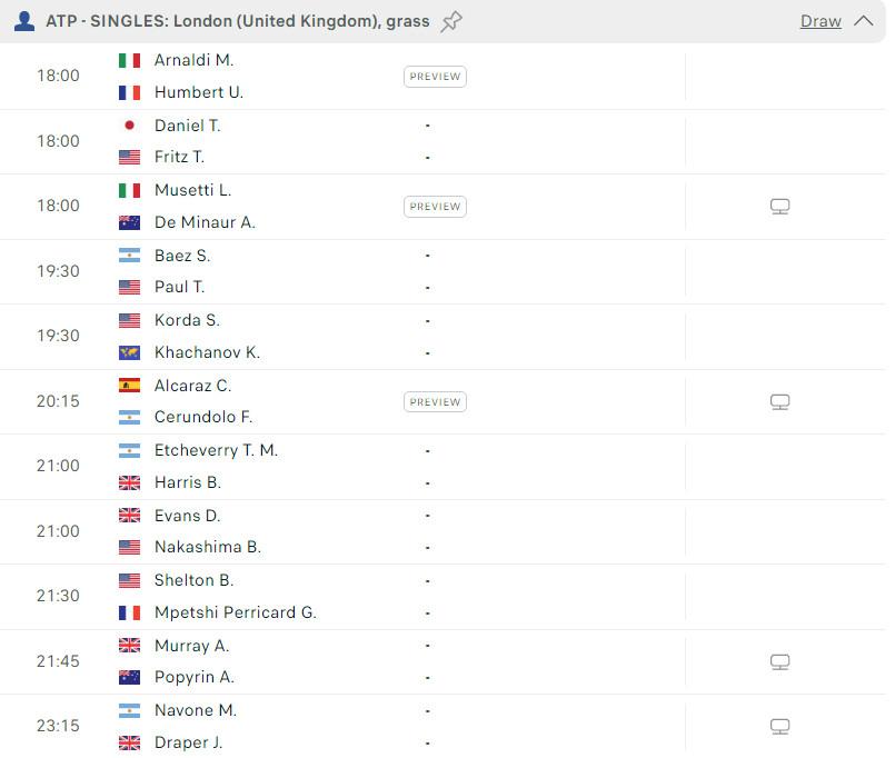 Lịch thi đấu ATP Queen's Club 2024 - Vòng 1/16 đơn nam