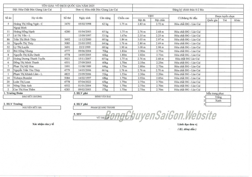Danh sách cầu thủ Hóa Chất Đức Giang giai đoạn 2 giải bóng chuyền VĐQG 2025