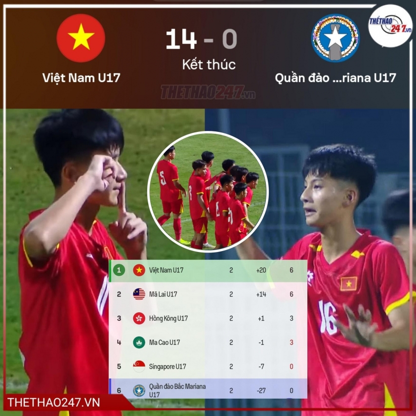 Chiến thắng 14-0 trước U17 Bắc Mariana giúp U17 Việt Nam vượt lên dẫn đầu bảng C và nhận lời khen ngợi đặc biệt từ AFC nhờ màn trình diễn toàn diện, áp đảo từ đầu tới cuối.