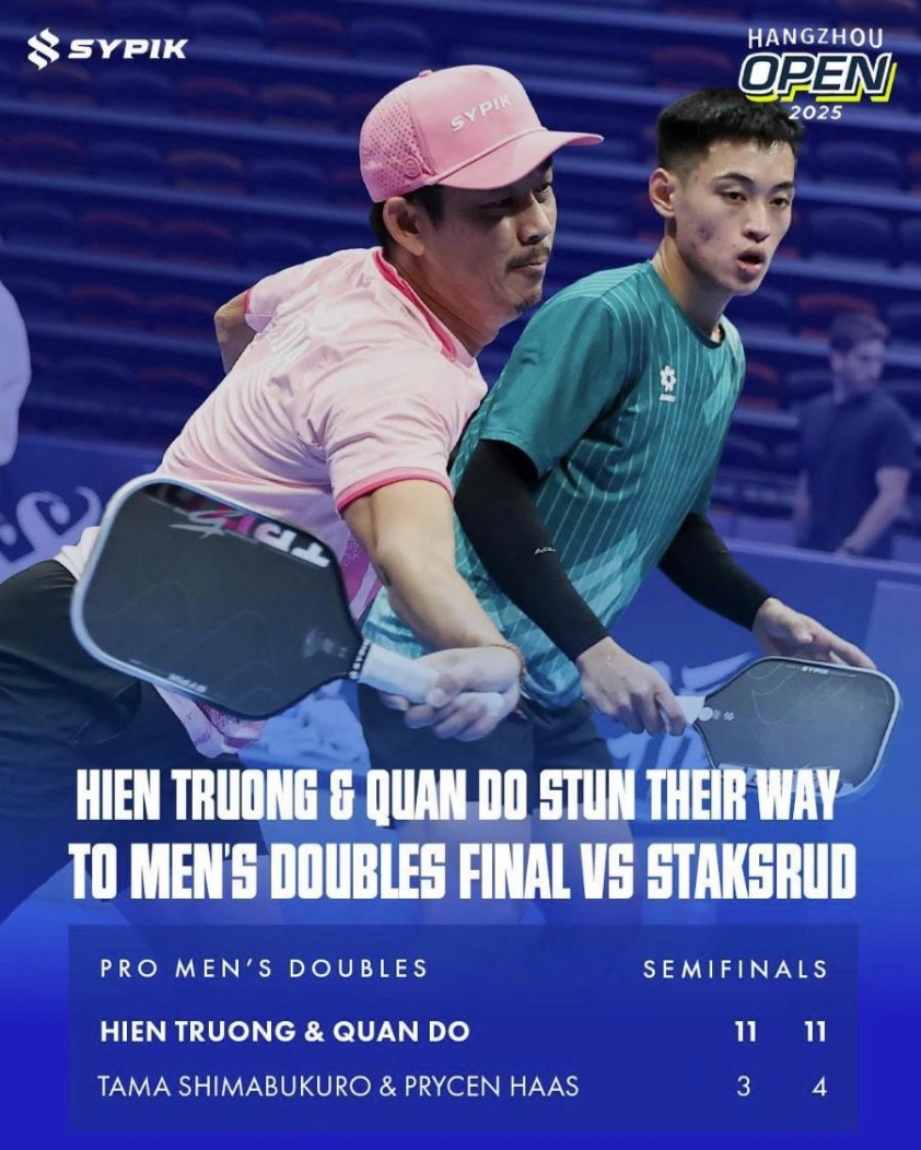 Đối thủ của họ trong trận chung kết sẽ là cặp hạt giống số một - bộ đôi gồm tay vợt hàng đầu thế giới Federico Staksrud và Akshay Bhatia. Trận chung kết đôi nam Pro sẽ diễn ra lúc 18h00 ngày 6/12 và được dự đoán sẽ vô cùng căng thẳng khi cả hai bên đều sở hữu phong độ thi đấu bùng nổ. Nhiều người hâm mộ kỳ vọng cặp Vinh Hiển - Minh Quân có thể tạo kỳ tích mới, mang về danh hiệu PPA Tour Asia đầu tiên cho Việt Nam.
