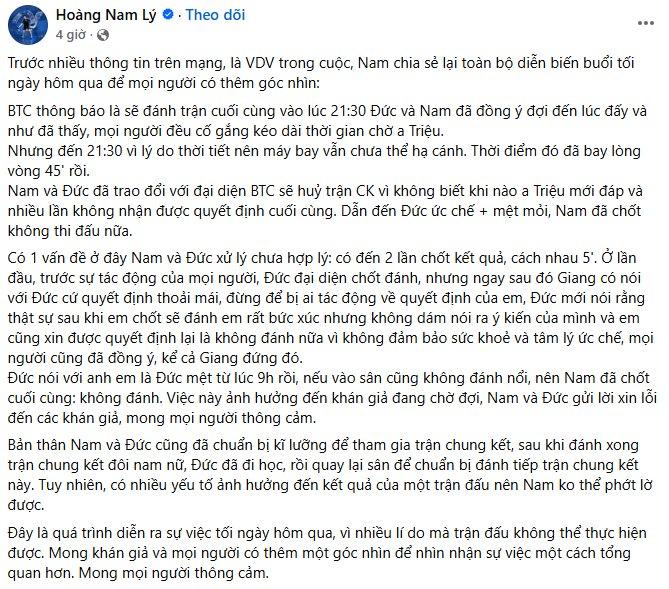 Sau nhiều giờ chờ đợi, khi Triệu "cầu lông" không đến đúng giờ, Lý Hoàng Nam và Lê Xuân Đức đã quyết định hủy trận đấu. Đức cảm thấy mệt mỏi về thể chất và tinh thần, không thể tiếp tục thi đấu, và quyết định không vào sân nữa. Cặp đôi này đã được trao chức vô địch, nhưng quyết định hủy bỏ trận chung kết gây ra làn sóng phẫn nộ trong cộng đồng. Lý Hoàng Nam lên mạng xin lỗi khán giả, giải thích rằng sức khỏe và tinh thần đồng đội là yếu tố quan trọng nhất, và việc không thi đấu được là vì sự mệt mỏi và ức chế từ sự chậm trễ của đối thủ.