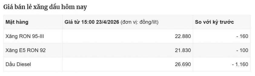 Giá xăng dầu hôm nay 23/4: Xăng RON 95-III giảm xuống dưới 23.000 đồng