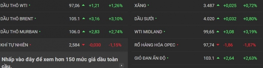 Giá dầu thô trên thị trường quốc tế tăng mạnh trong bối cảnh căng thẳng địa chính trị tại Iran leo thang và nguy cơ gián đoạn nguồn cung gia tăng. Kết phiên, giá dầu Brent đạt 105,07 USD/thùng, tăng 3,16 USD, tương đương 3,1%, trong khi dầu WTI cũng tăng 2,89 USD, lên mức 95,85 USD/thùng.