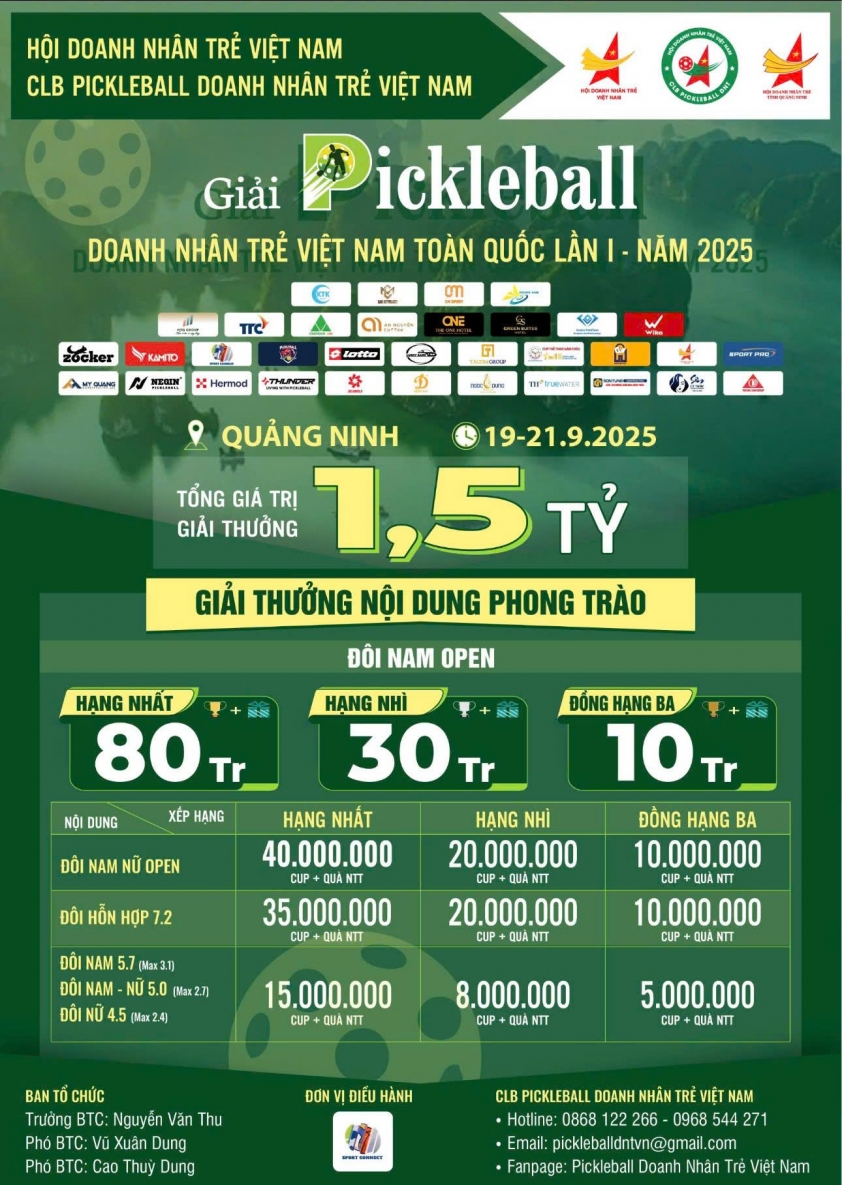 Giải Pickleball Doanh nhân trẻ Việt Nam Toàn quốc 2025 đang dần hoàn thiện những bước chuẩn bị cuối cùng, nhờ sự góp sức mạnh mẽ từ các nhà tài trợ và thương hiệu thể thao uy tín.