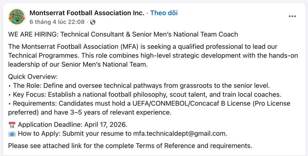 Trong thế giới bóng đá hiện đại, việc bổ nhiệm huấn luyện viên trưởng thường là kết quả của những cuộc đàm phán bí mật hoặc thông qua các công ty môi giới cầu thủ danh tiếng. Tuy nhiên, Liên đoàn Bóng đá Montserrat (MFA) đã quyết định phá vỡ mọi quy tắc truyền thống bằng cách đăng tin tuyển dụng vị trí HLV trưởng đội tuyển nam quốc gia ngay trên trang Facebook chính thức của mình.