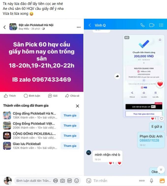 Chị Linh - một người chơi tại Hà Nội, kể lại rằng khi tìm sân ở khu vực quận Hoàn Kiếm qua Facebook, chị nhận được tin nhắn từ một tài khoản tự xưng là quản lý sân. Sau khi trao đổi và được hướng dẫn liên hệ qua Zalo, chị đã vội chuyển 300.000 đồng tiền cọc mà không kiểm tra kỹ thông tin. “Chuyển tiền xong thì bị chặn cả Facebook lẫn Zalo. Lúc tra cứu lại thì mới biết không có sân nào như họ nói. Mình cũng nghi ngờ, nhưng họ bảo đây là sân mới nên tin luôn”, chị chia sẻ.
